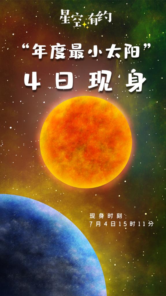 今年,地球運行到遠日點(diǎn)的時(shí)刻是7月4日15時(shí)11分。此時(shí),太陽(yáng)視直徑為31分28秒,堪稱(chēng)“年度最小太陽(yáng)”,大約比今年1月4日地球通過(guò)近日點(diǎn)時(shí)可見(jiàn)的日面視直徑小了3.4%。