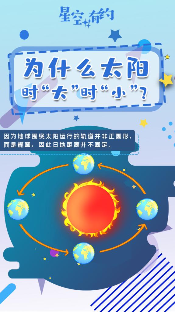 中科院紫金山天文臺科普主管王科超介紹,地球圍繞太陽(yáng)運行的軌道并非正圓形,而是一個(gè)偏心率為0.0167的橢圓。正因如此,日地距離并不固定,遠日點(diǎn)比近日點(diǎn)遠約500萬(wàn)千米。