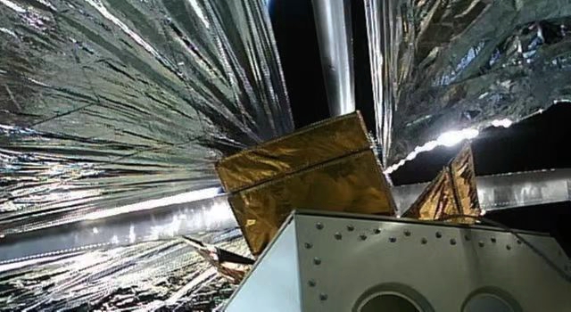 長(cháng)征二號丁遙六十四運載火箭載荷艙的離軌帆在太空展開(kāi)情景。(中國航天科技集團八院供圖)