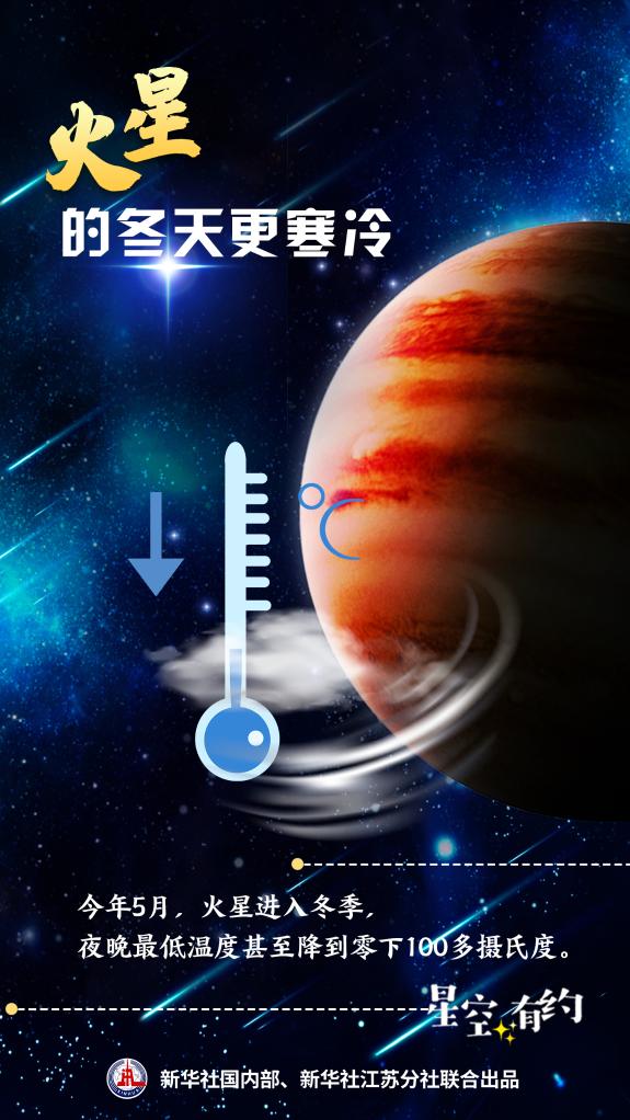 火星四季的溫度也和地球有較大區別。王科超說(shuō),火星到太陽(yáng)的距離是日地距離的1.52倍,接收到太陽(yáng)輻射能量更少,只有地球的43%,因此火星上的每個(gè)季節,都比地球上更加寒冷?!氨热?,今年5月火星北半球進(jìn)入冬季,夜晚最低溫度甚至降到零下100多攝氏度?!?/p>