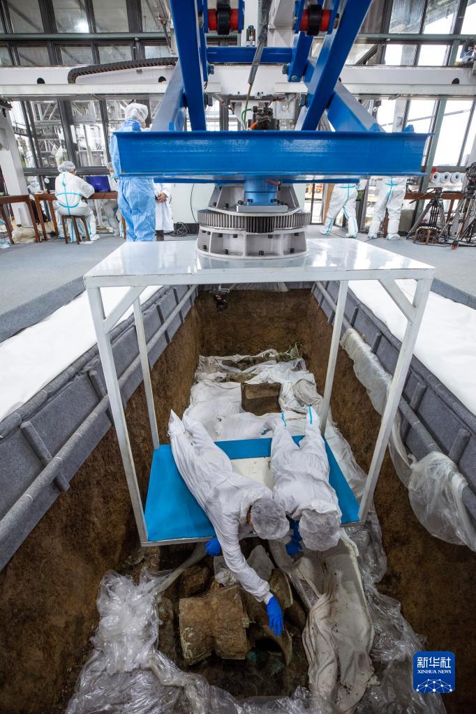 在三星堆遺址考古發(fā)掘現場(chǎng),考古人員利用特制的升降設施在3號“祭祀坑”內作業(yè),以減少對坑內文物的影響(2021年3月19日攝)。新華社記者 沈伯韓 攝
