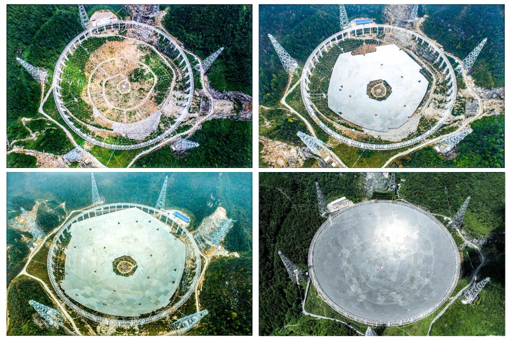 這是一張拼版照片:依次為“中國天眼”拼裝第一塊反射面板(左上,2015年8月攝)、“中國天眼”反射面板安裝近半(右上,2015年12月攝)、“中國天眼”反射面板安裝近八成(左下,2016年3月攝)、維護保養期間的“中國天眼”(右下,2022年7月攝)(無(wú)人機照片)。新華社記者 歐東衢 攝