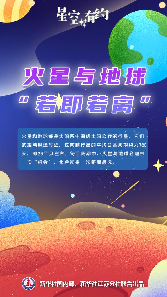 王科超介紹,火星和地球都是太陽(yáng)系中圍繞太陽(yáng)公轉的行星,它們之間的距離時(shí)遠時(shí)近。這兩顆行星的平均會(huì )合周期約為780天,即26個(gè)月左右。每個(gè)周期中,火星與地球會(huì )迎來(lái)一次“相會(huì )”,也會(huì )迎來(lái)一次距離最遠。本輪會(huì )合周期里,火星已于2022年12月1日運行至距離地球最近的位置,當時(shí)與地球距離約為0.54個(gè)天文單位。