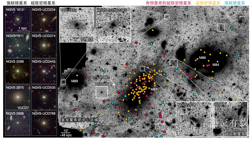 圖為部分強核矮星系和超致密矮星系的光學(xué)圖像,以及其在室女星系團中心區域的空間分布。(受訪(fǎng)者供圖)