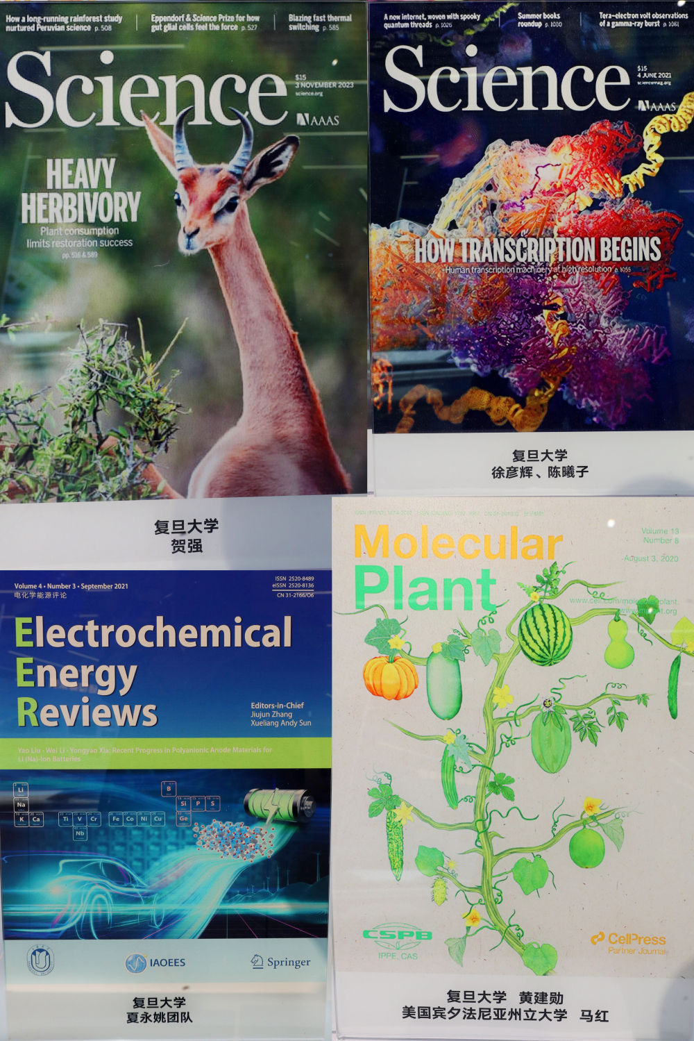 拼版照片是2023年11月29日在上??萍紕?chuàng )新成果展上拍攝的以復旦大學(xué)科研成果為封面的刊物。新華社記者 方喆 攝