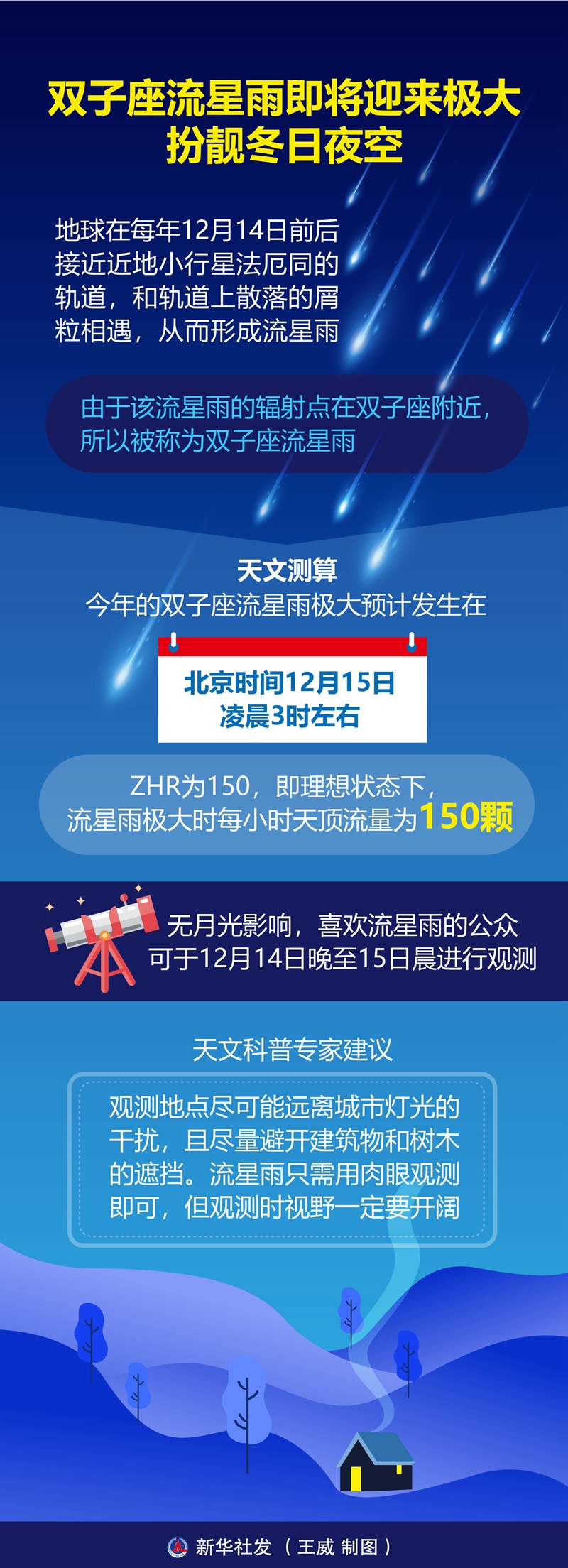如何觀(guān)測這場(chǎng)今冬最好看的流星雨?修立鵬建議,觀(guān)測地點(diǎn)盡可能遠離城市燈光的干擾,且盡量避開(kāi)建筑物和樹(shù)木的遮擋。流星雨只需用肉眼觀(guān)測即可,但觀(guān)測時(shí)視野一定要開(kāi)闊,不要只盯著(zhù)流星雨的輻射點(diǎn)看,流星可能在天空中的任意位置出現。