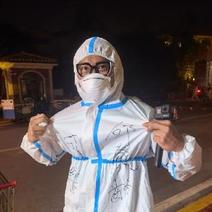 鏡頭下當然少不了愛(ài)“秀”的阿樂(lè )自己。盡管被“包裹”得嚴嚴實(shí)實(shí),朋友們還是能從防護服上“邱慶齡·阿樂(lè )”的字樣,以及防護面罩下微笑的眼睛,認出那個(gè)樂(lè )觀(guān)開(kāi)朗的阿樂(lè )。