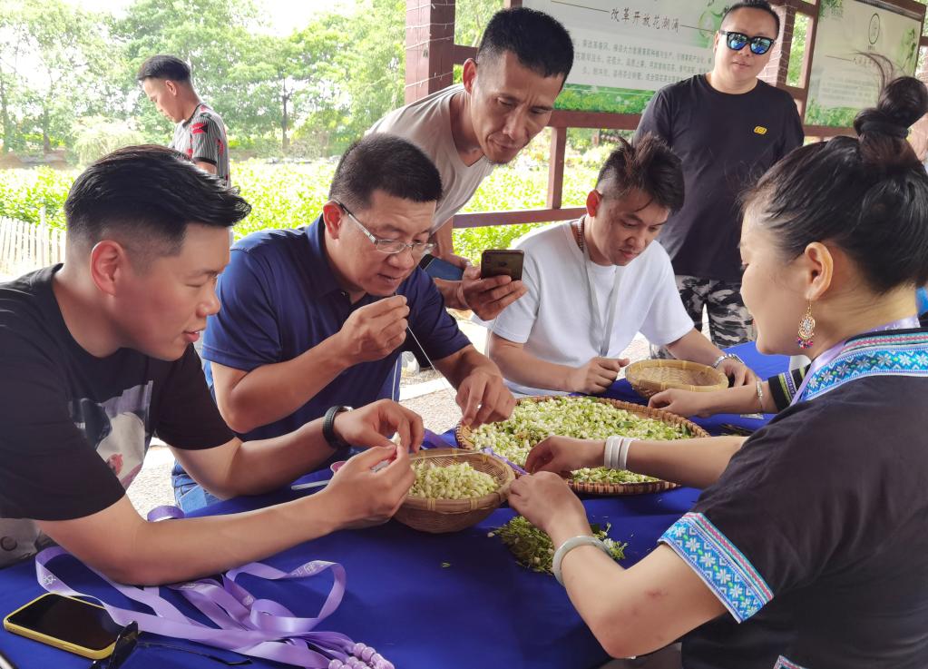 2021年6月,臺青在廣西橫縣的茉莉花盆栽基地體驗茉莉花文創(chuàng )產(chǎn)品制作。新華社發(fā)
