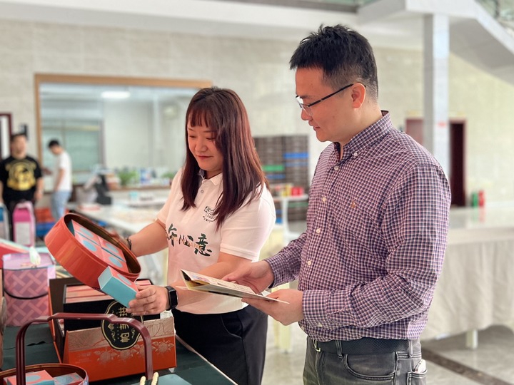 圖為沈益昌(右)和員工在位于陜西咸陽(yáng)的公司里查看食品禮盒(5月13日攝)。新華社記者蔡馨逸 攝