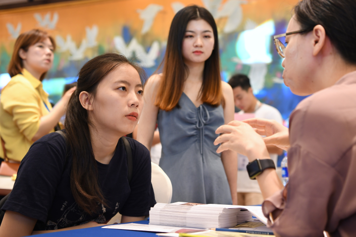 在臺灣專(zhuān)業(yè)人才就業(yè)創(chuàng )業(yè)廈門(mén)對接會(huì )上,臺青與用人單位招聘人員交流。新華社記者 姜克紅 攝