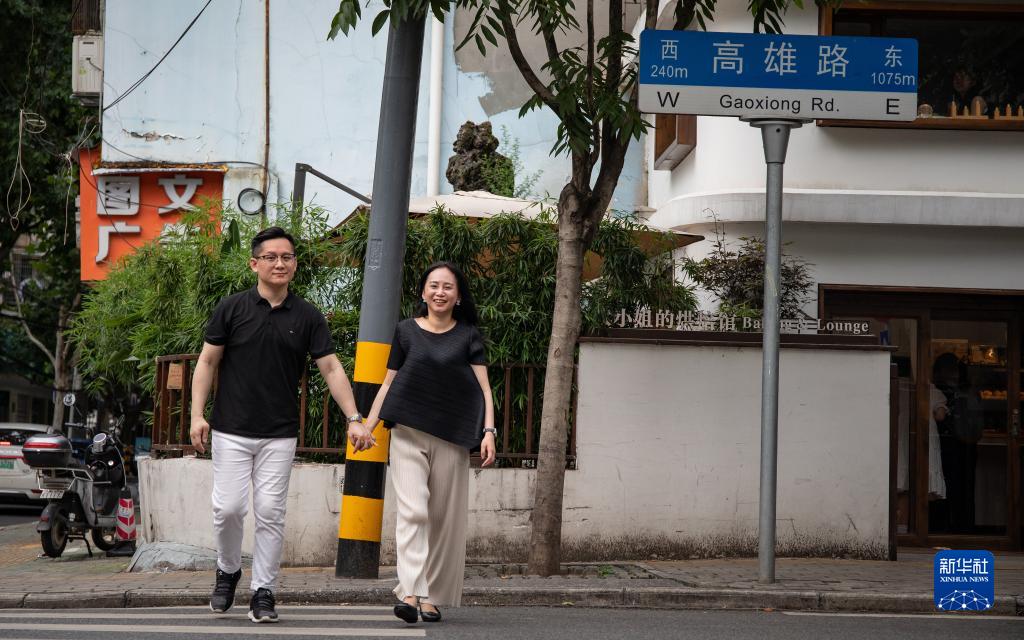 7月2日,臺灣青年張立綸和妻子走在武漢市高雄路上。新華社記者 饒饒 攝