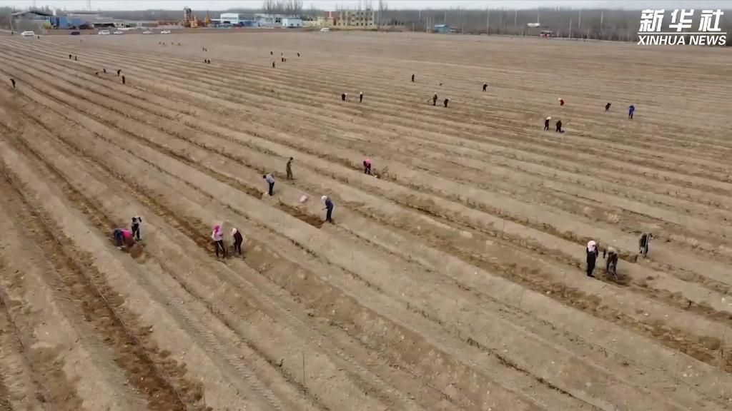 目前,寧夏賀蘭山東麓葡萄酒產(chǎn)區正在開(kāi)展展藤工作。
