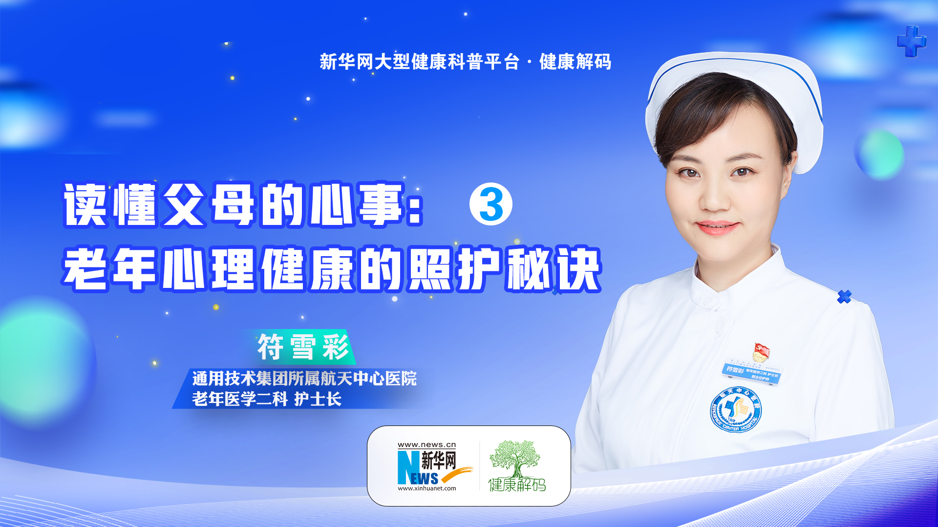 "??本集我們邀請了通用技術(shù)集團所屬航天中心醫院老年醫學(xué)二科護士長(cháng)、主任護師符雪彩分享《讀懂父母的心事——老年心理健康的照護秘訣????》。"
