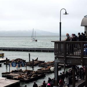 8月15日,人們在美國舊金山海邊觀(guān)看海獅。
