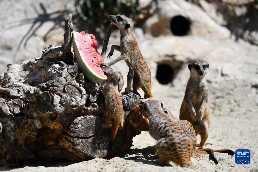 8月26日,貓鼬在意大利羅馬動(dòng)物園享用冰鎮西瓜。