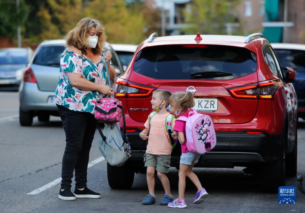 9月8日,一名家長(cháng)在西班牙馬德里送孩子上學(xué)。