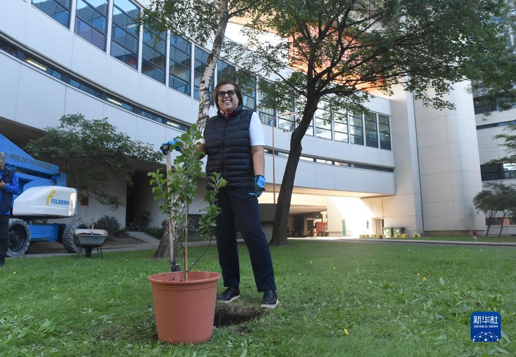9月28日,工作人員在聯(lián)合國維也納國際中心院內準備栽種“牛頓太空樹(shù)苗”。