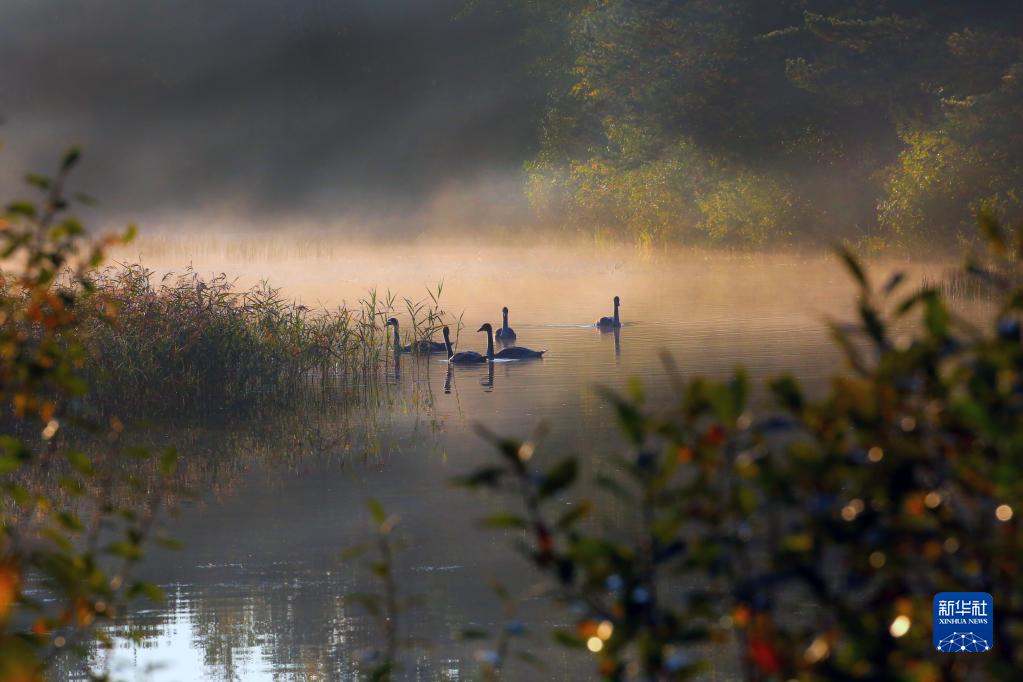 10月1日,水禽在白俄羅斯首都明斯克郊外的水面上游弋。