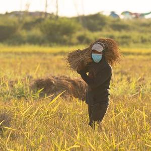 10月25日,農民在老撾萬(wàn)象城邊的田地里收割稻谷。