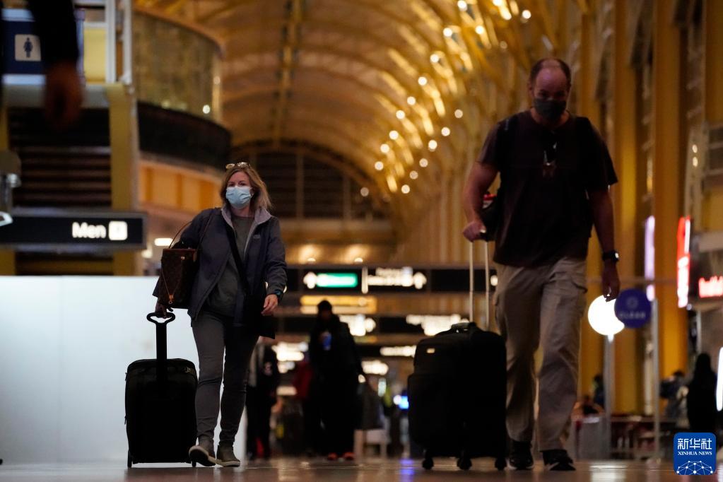 11月8日,在美國弗吉尼亞州阿靈頓的里根國家機場(chǎng),旅客戴著(zhù)口罩走在航站樓里。
