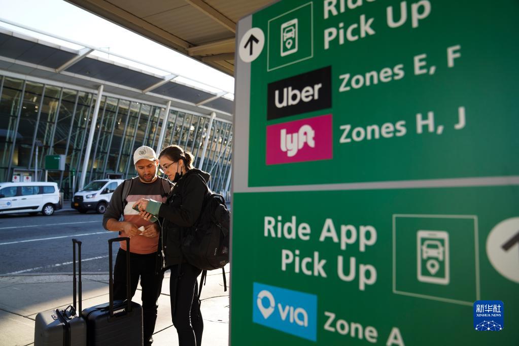 11月8日,旅客在美國紐約肯尼迪國際機場(chǎng)等待乘車(chē)離開(kāi)。