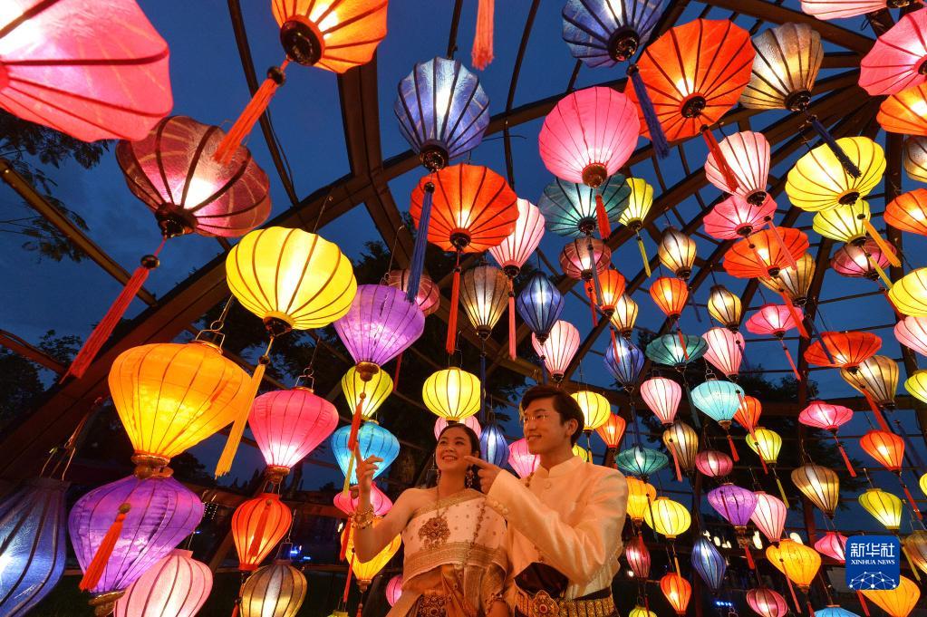 11月8日,游客在泰國北欖府舉行的國際燈籠美食節預展活動(dòng)上觀(guān)賞燈籠。