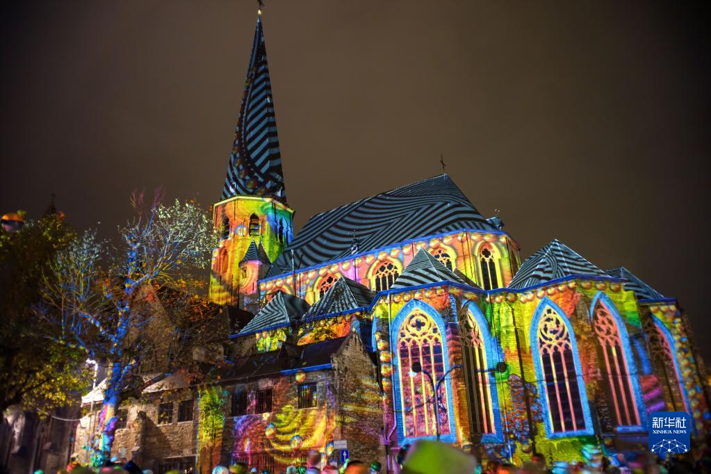 這是11月11日在比利時(shí)根特燈光節上拍攝的燈光藝術(shù)作品。