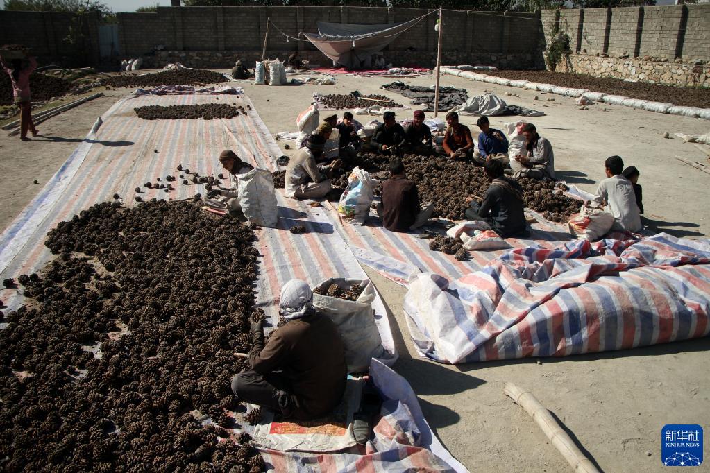 11月12日,在阿富汗米特拉姆,人們敲打松塔獲得松子。