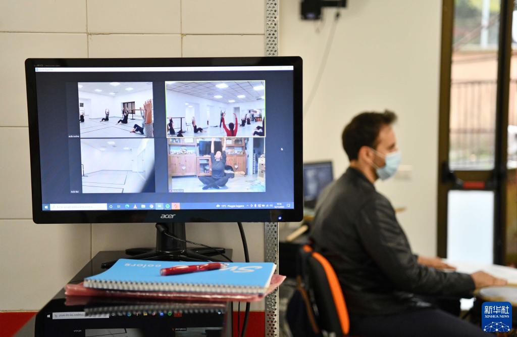 11月16日,在意大利羅馬國家舞蹈學(xué)院,電腦屏幕顯示學(xué)生通過(guò)線(xiàn)上線(xiàn)下相結合的方式參加現代舞課程。