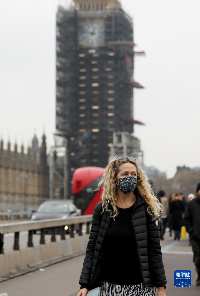 11月24日,在英國倫敦,佩戴口罩的行人走過(guò)威斯敏斯特橋。
