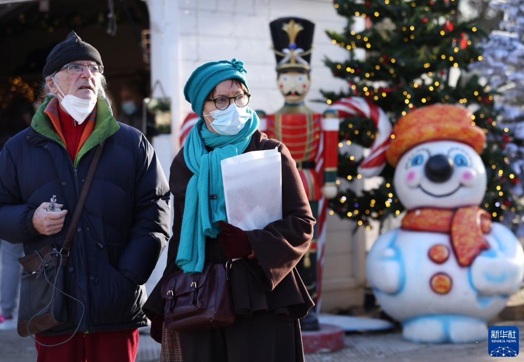 12月9日,人們戴口罩參觀(guān)法國巴黎一處圣誕市場(chǎng)。
