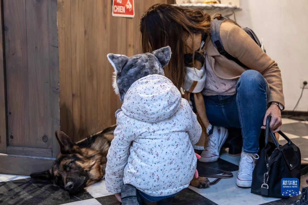 12月22日,在法國北部城市里爾名為Waf Cafe的咖啡館,顧客與狗狗互動(dòng)。