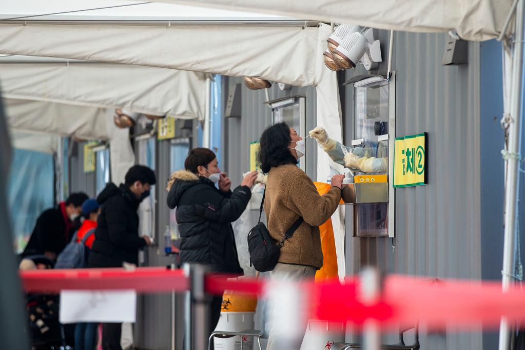 12月11日,在韓國首爾廣場(chǎng)新冠檢測點(diǎn),民眾接受核酸采樣。新華社記者王益亮攝