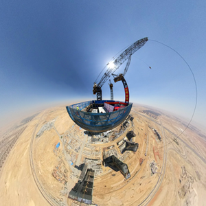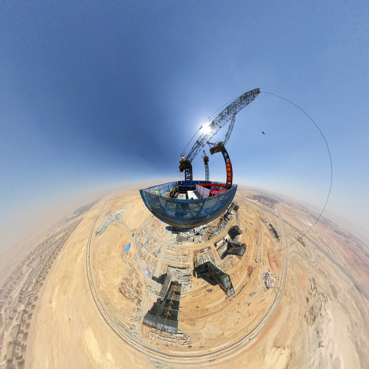 2021年6月17日拍攝的埃及新首都中央商務(wù)區標志塔主體建筑封頂建設現場(chǎng)(全景相機拍攝)。新華社記者隋先凱攝