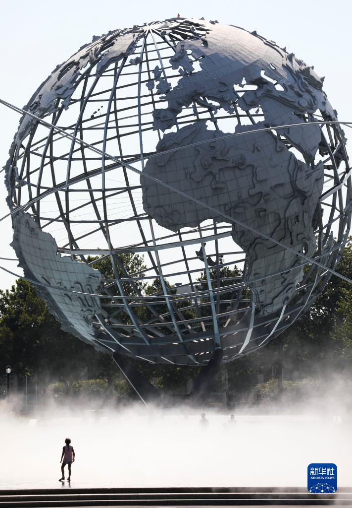 2021年8月13日,一名兒童冒著(zhù)高溫天氣站在美國紐約科羅納公園水霧廣場(chǎng)的地球模型前。
