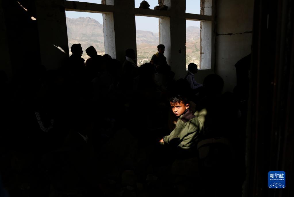 2021年8月14日,一名男孩坐在也門(mén)伊卜省被戰火損毀的一棟教學(xué)樓內。