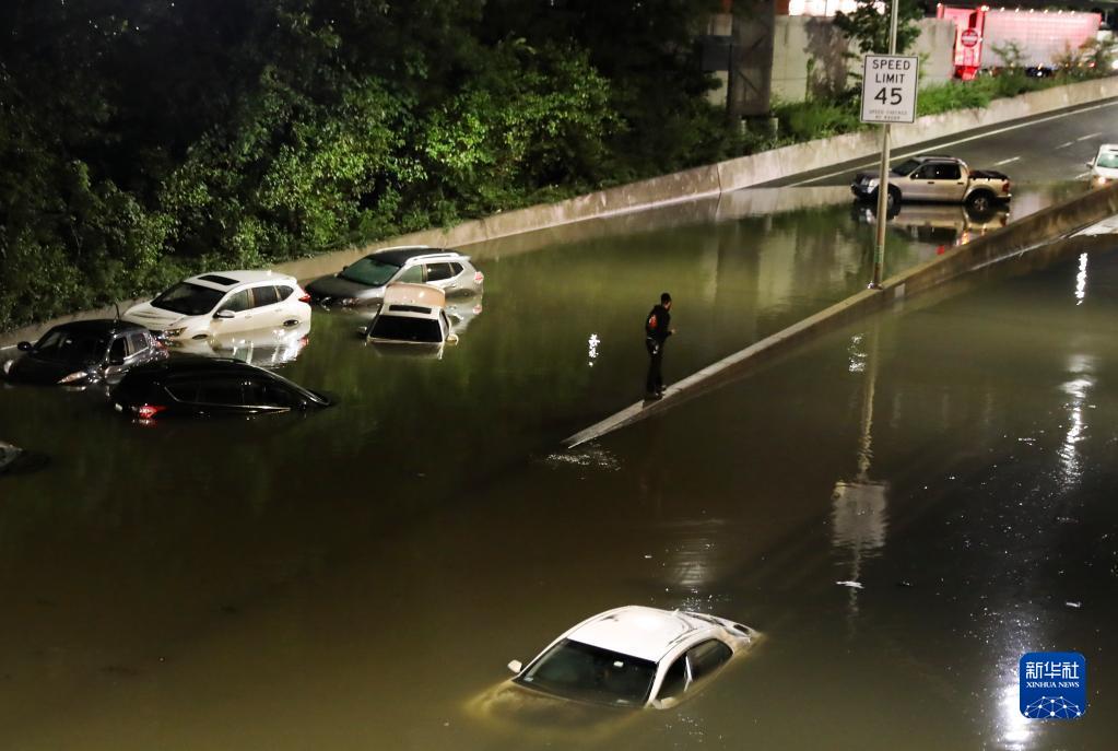 2021年9月2日,在美國紐約的一條主要道路,車(chē)輛被暴雨造成的積水淹沒(méi)。颶風(fēng)“艾達”橫掃美國東部各州,所過(guò)之處生命財產(chǎn)損失慘重。