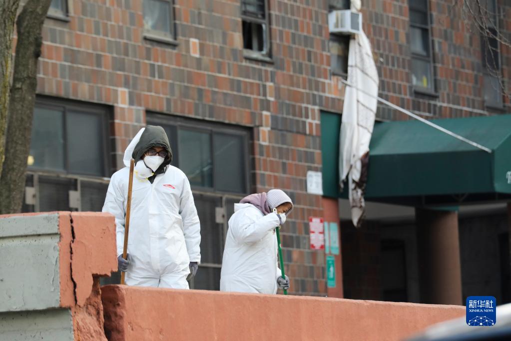 1月10日,工作人員在美國紐約市布朗克斯區發(fā)生火災的公寓樓外進(jìn)行清理工作。