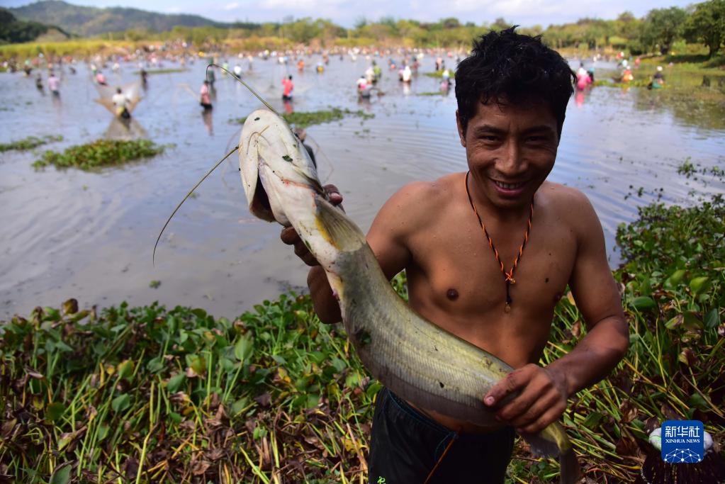 1月13日,在印度阿薩姆邦高哈蒂一處村莊,一名當地村民手捧漁獲。當日,村民參加捕魚(yú)活動(dòng),慶祝收獲季的結束。新華社發(fā)