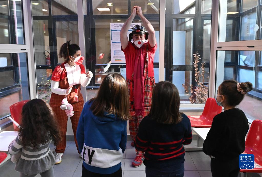 1月16日,工作人員扮成小丑在意大利博洛尼亞一處新冠疫苗接種中心與兒童互動(dòng)。
