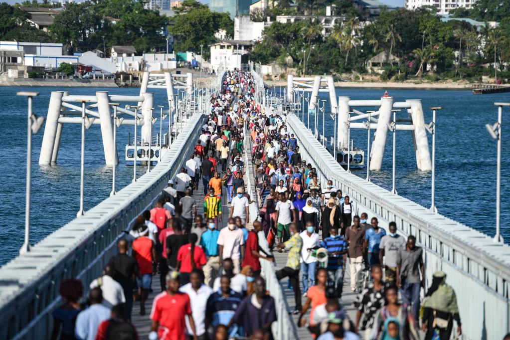 2022年1月4日,在肯尼亞蒙巴薩,當地居民在利科尼浮橋上通行。新華社記者李琰攝