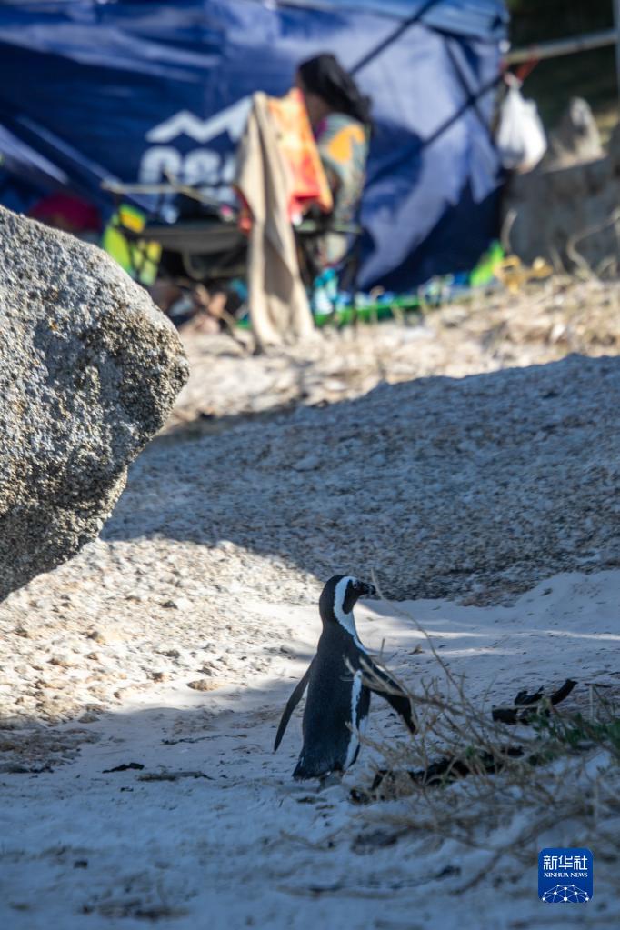 2月5日,一只非洲企鵝走在南非西蒙鎮的公共海灘上。