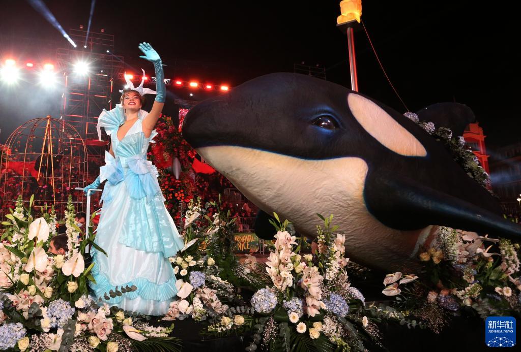 這是2月12日在法國南部城市尼斯拍攝的狂歡節花車(chē)夜間游行現場(chǎng)。