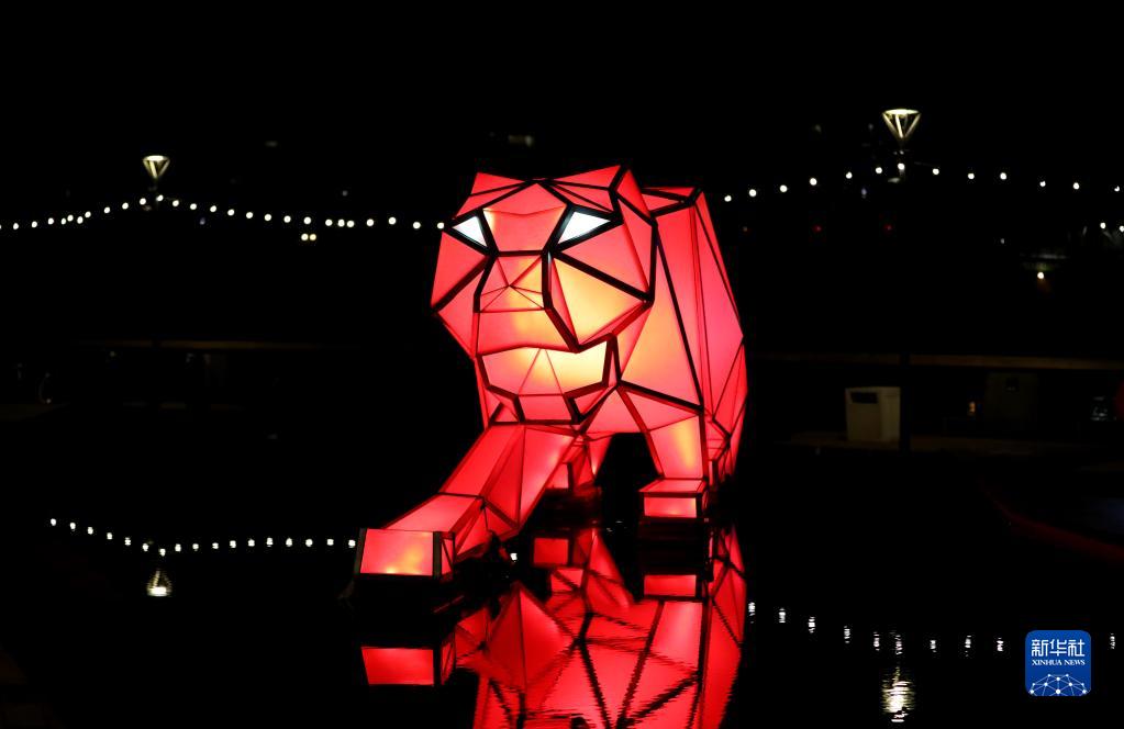 2月17日,在英國倫敦,慶祝中國虎年的燈光藝術(shù)裝置在巴特西發(fā)電站燈光節上展出。