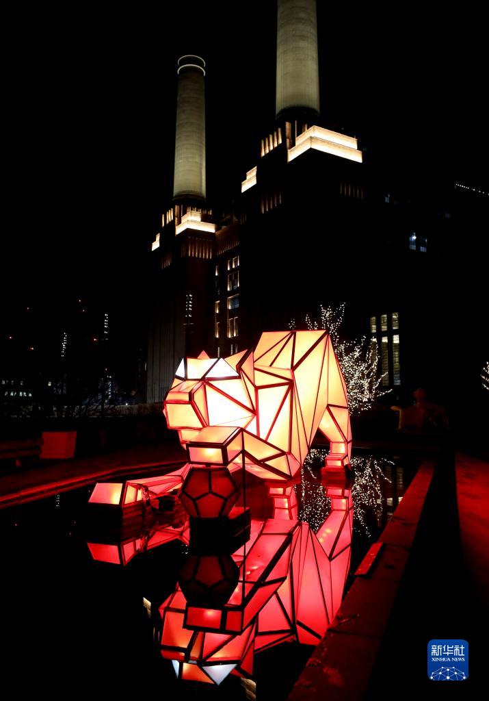 2月17日,在英國倫敦,慶祝中國虎年的燈光藝術(shù)裝置在巴特西發(fā)電站燈光節上展出。