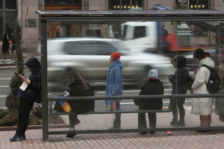 2月10日,市民在烏克蘭基輔一處公交站等車(chē)。新華社發(fā)(謝爾蓋·斯塔拉斯堅科攝)