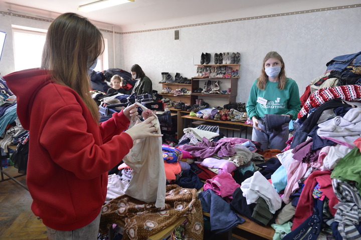 2月22日,在俄羅斯羅斯托夫州一處臨時(shí)安置點(diǎn),工作人員整理衣物。新華社發(fā)(安德烈攝)