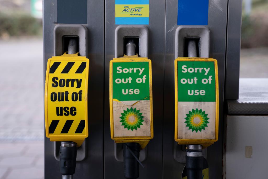 2022年3月17日,在英國曼徹斯特一處加油站,加油機上掛著(zhù)“停止使用”的標識。新華社發(fā)(喬恩·休珀攝)