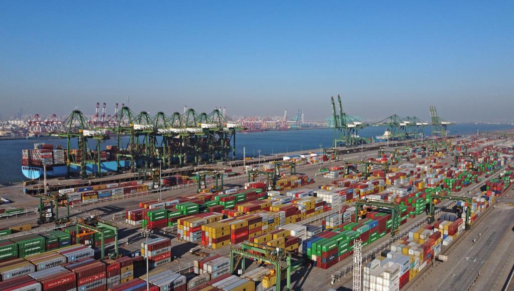 這是2021年12月18日拍攝的天津港太平洋國際集裝箱碼頭(無(wú)人機照片)。新華社記者趙子碩 攝