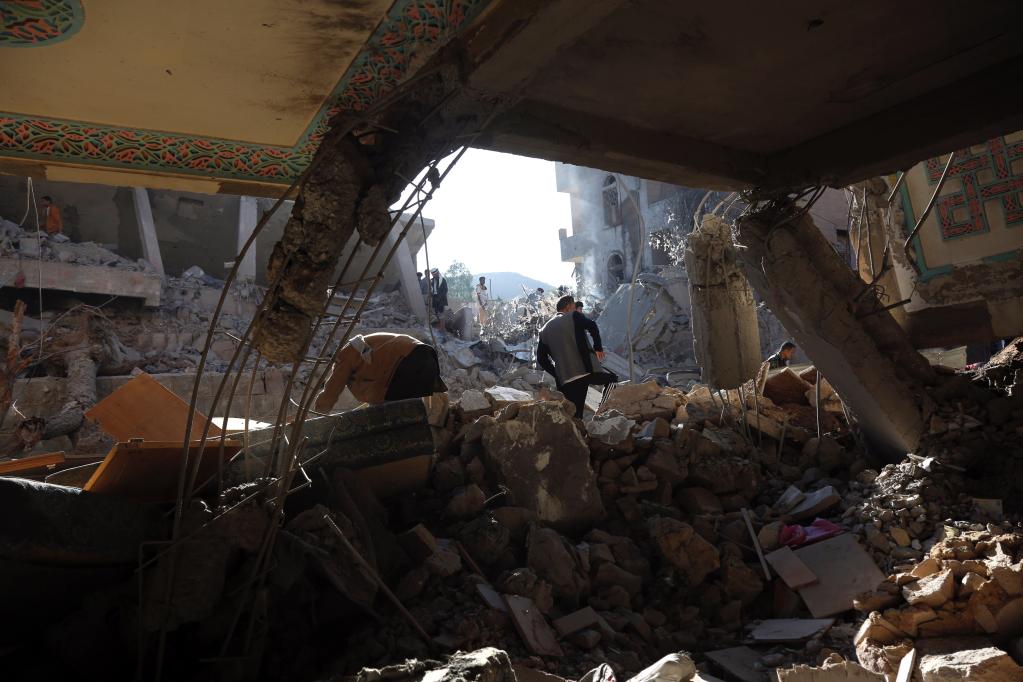 1月18日,在也門(mén)首都薩那,人們查看空襲過(guò)后的廢墟。以沙特為首的多國聯(lián)軍當天凌晨宣布,對也門(mén)胡塞武裝在薩那的據點(diǎn)和營(yíng)地發(fā)動(dòng)了空襲。新華社發(fā)(穆罕默德攝)